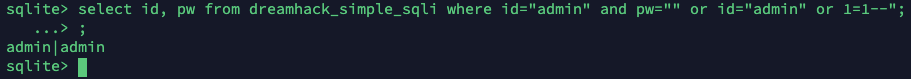 이제 쿼리문은 "을 사용하고, DB는 SQLite을 사용하는 것을 알았으니, admin을 SQLi 공격 시도하겠다.