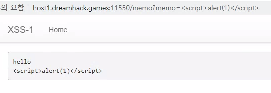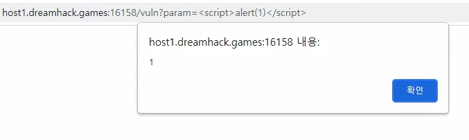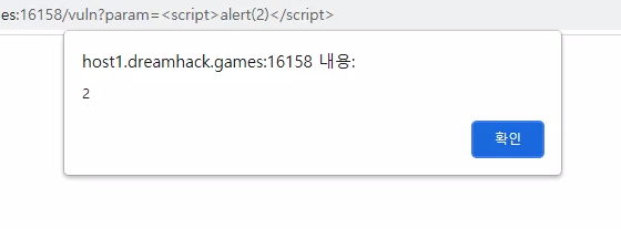 해당 페이지에 들어가 보니, vuln?param=<script>alert(1)</script>으로 열렸다. param에 들어간 값이 페이지에 그대로 적용이 돼서 Alert가 떴다.