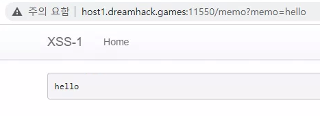 페이지에 들어가니, memo?memo=hello로 열렸다. 그리고 회색 박스 안에 hello가 적힌 페이지가 출력되었다.