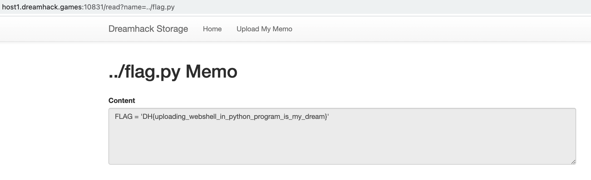 그 결과 flag.py의 내용이 그대로 출력되어 Flag를 획득할 수 있었다.