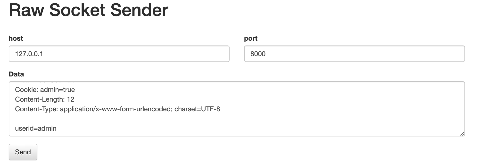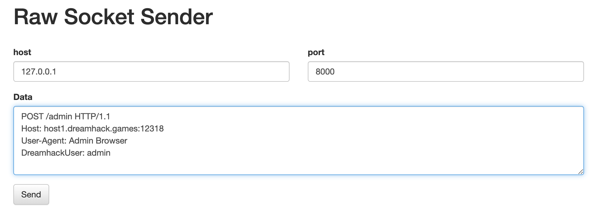 일단 첫번째 조건이 자기 자신이 아니면 안된다는 조건임으로 Socket 페이지를 이용하여 admin 페이지에 HTTP 패킷을 전달하겠다. 해당 서버는 8000으로 열려있다.