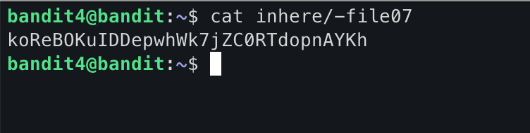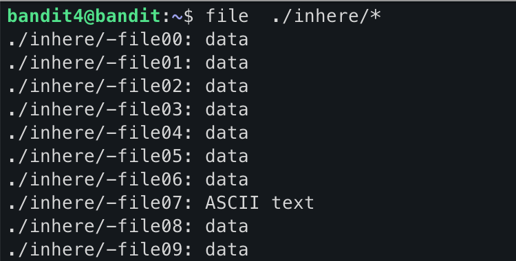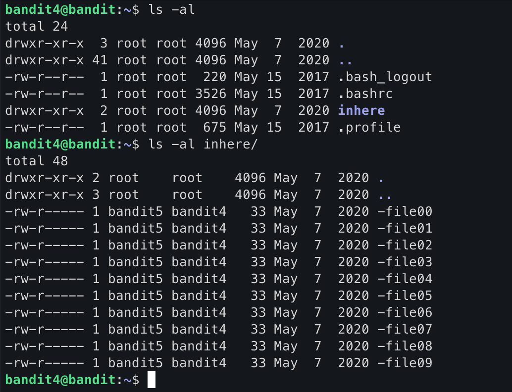 bandit3 문제처럼 ls 명령어로 확인한 결과 inhere 디렉토리에 많은 파일이 확인되었다.