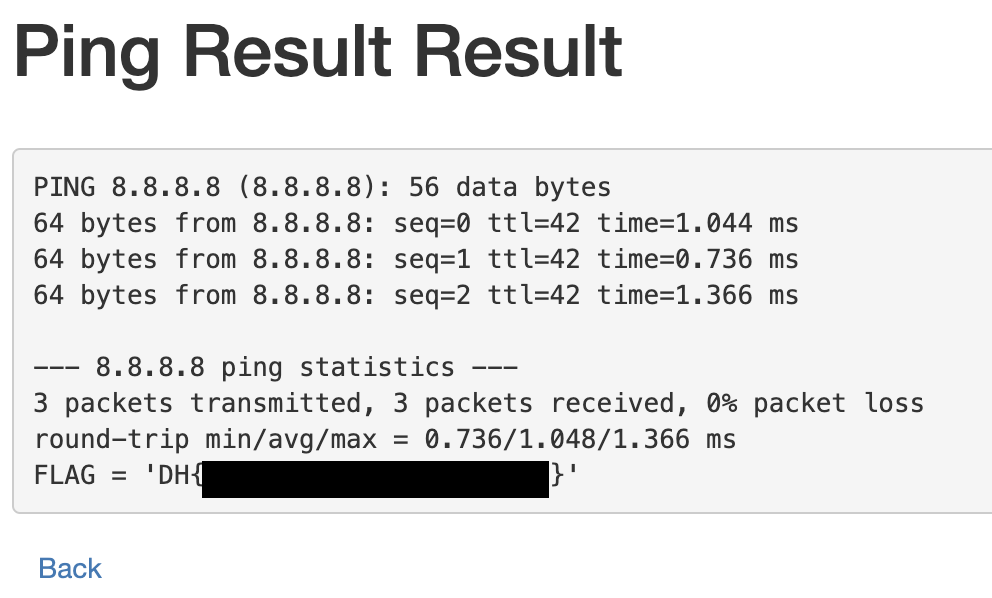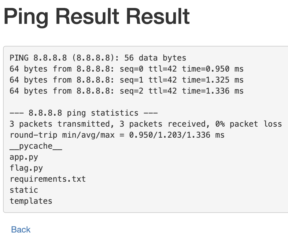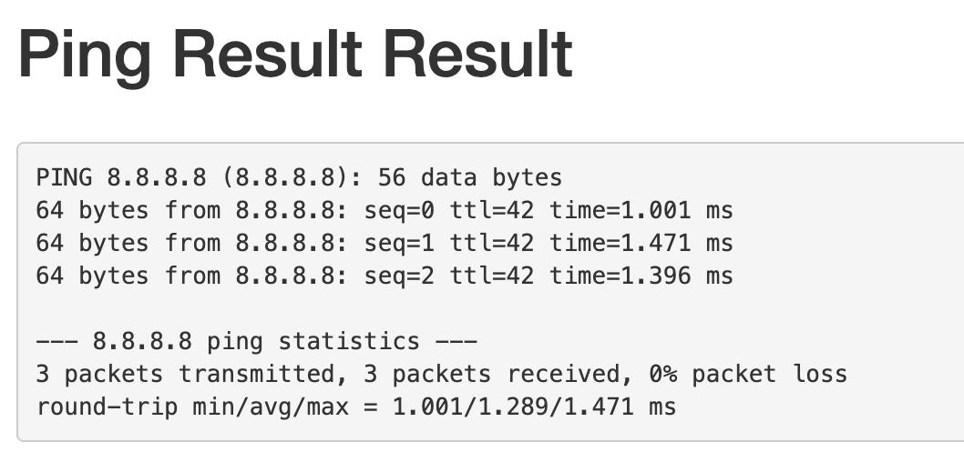 input에 8.8.8.8를 넣어서 Ping! 버튼을 클릭하니, 위와 같은 결과를 얻을 수 있었다.
