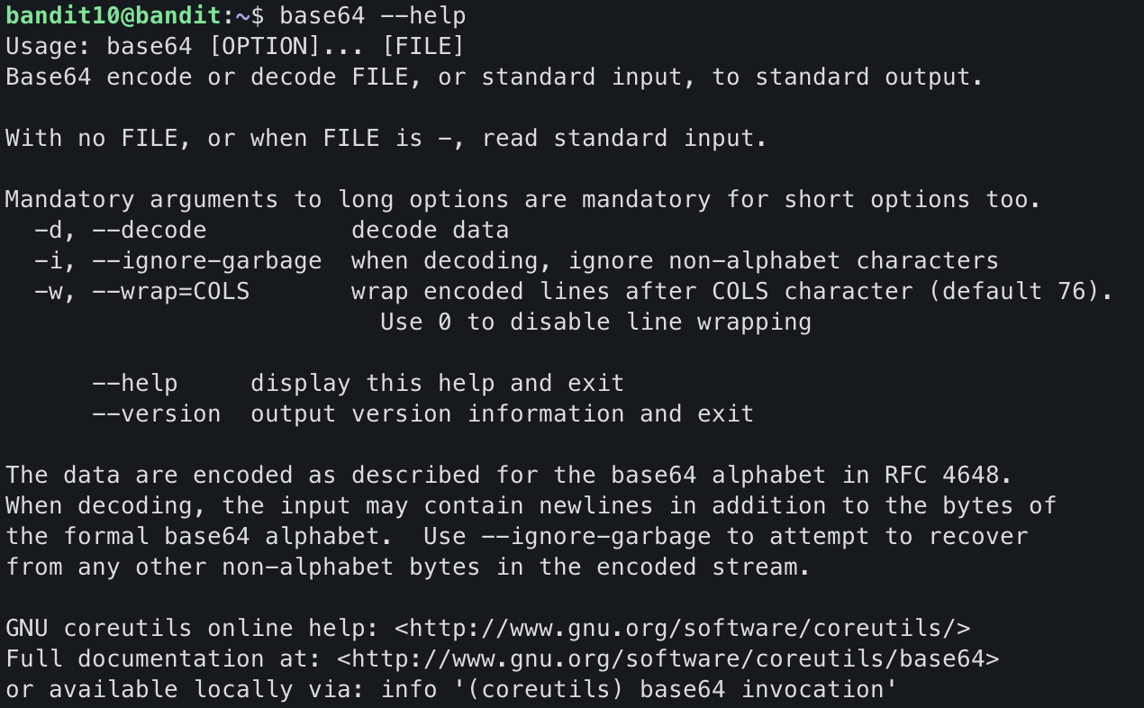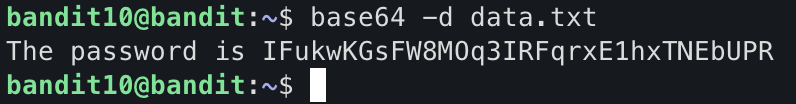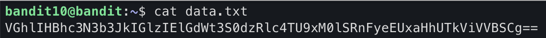 data.txt 파일을 확인한 결과 bandit11의 pw가 base64 인코딩되어있는 것으로 보인다.