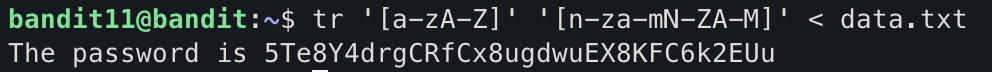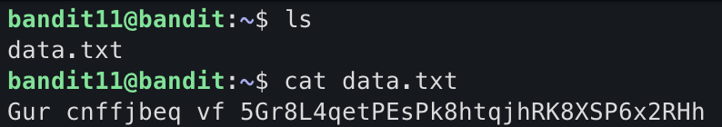 The password for the next level is stored in the file data.txt, where all lowercase (a-z) and uppercase (A-Z) letters have been rotated by 13 positions