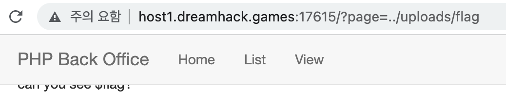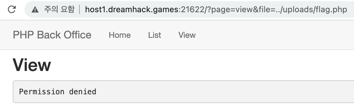 제일 의심가는 flag.php를 확인해보니, View 페이지로 이동하였고 flag.php의 내용을 보지 못하게 막았다.