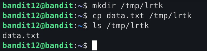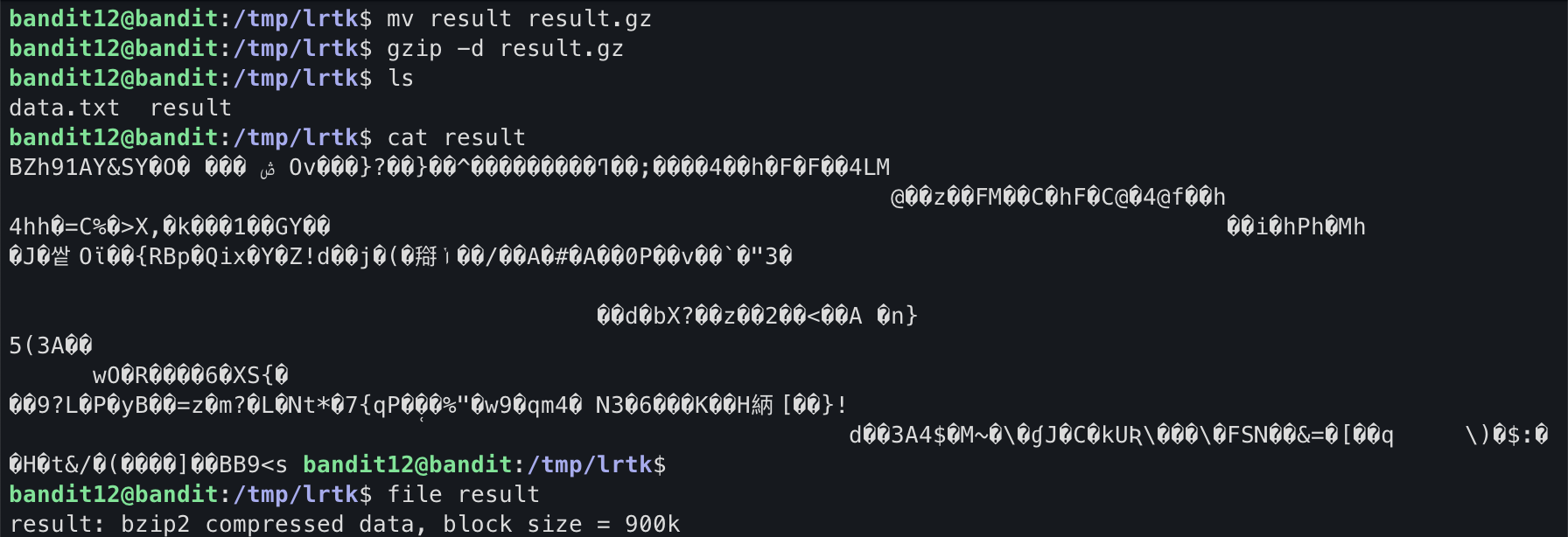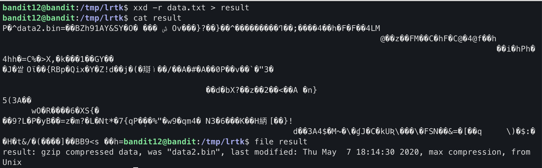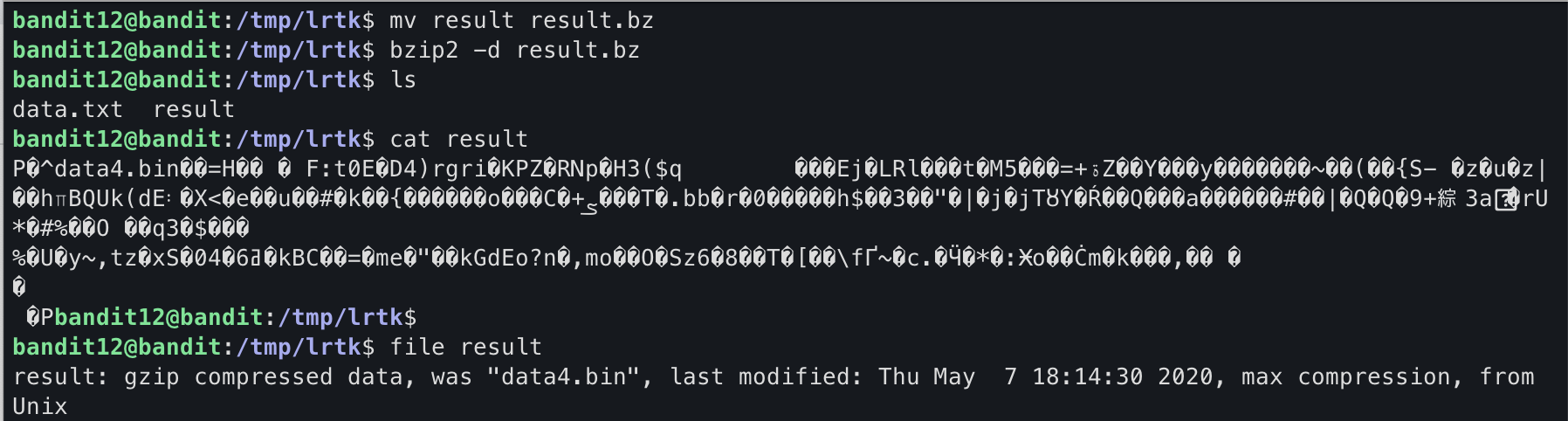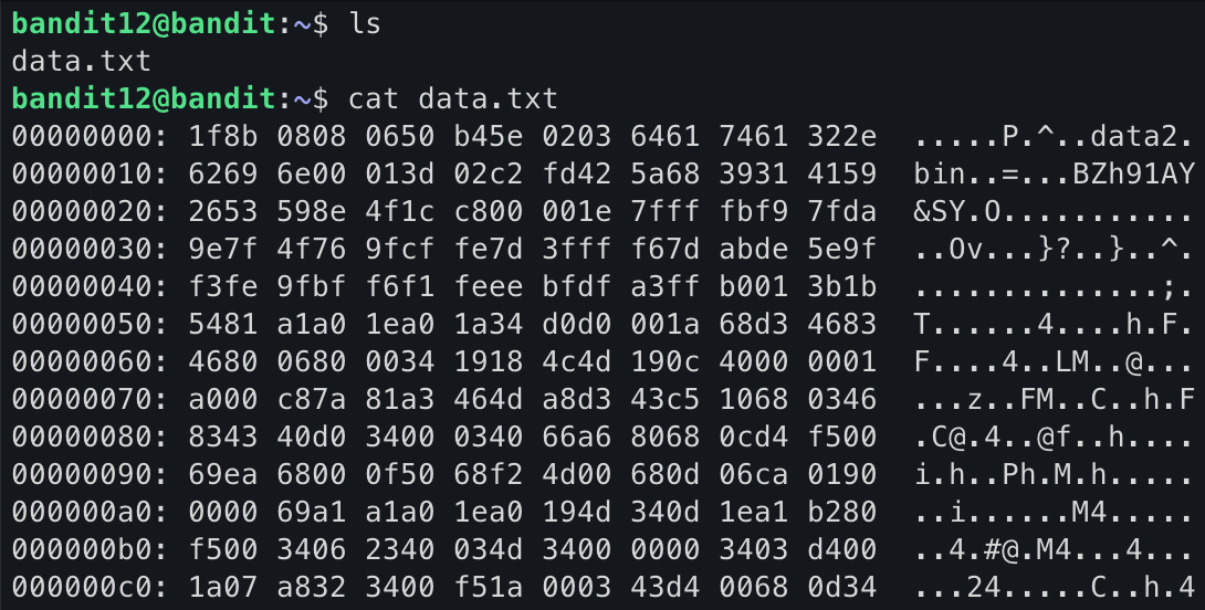 The password for the next level is stored in the file data.txt, which is a hexdump of a file that has been repeatedly compressed. For this level it may be useful to create a directory under /tmp in which you can work using mkdir. For example: mkdir /tmp/myname123. Then copy the datafile using cp, and rename it using mv (read the manpages!)