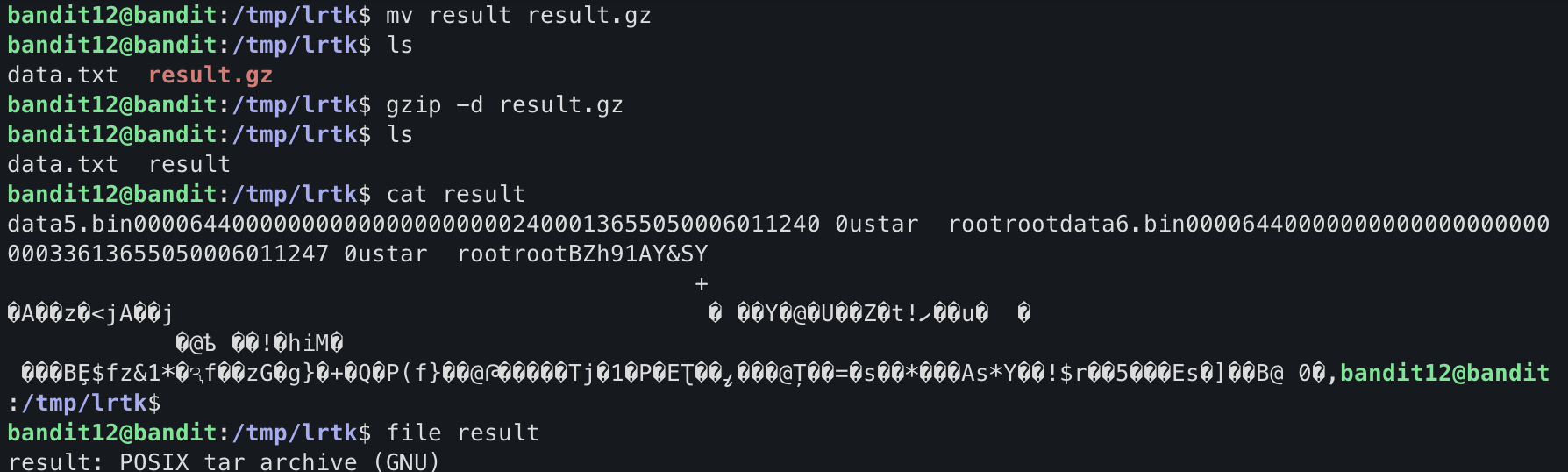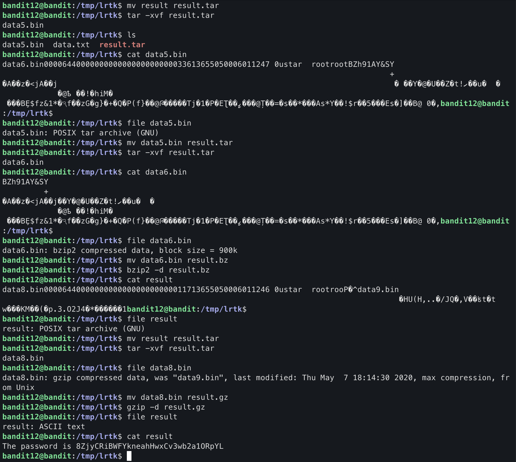이번에도 위와 같은 방법으로 진행했지만, bandit13의 pw을 얻을 수 없었고 tar으로 압축한 파일을 얻을 수 있었다.