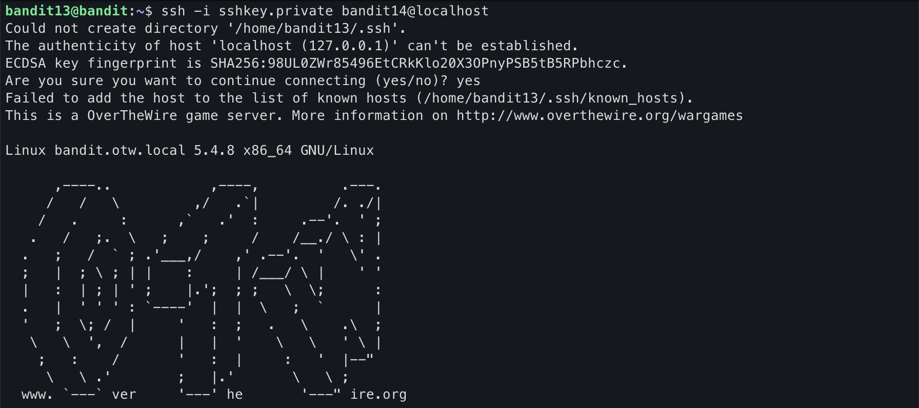 The password for the next level is stored in /etc/bandit_pass/bandit14 and can only be read by user bandit14. For this level, you don’t get the next password, but you get a private SSH key that can be used to log into the next level. Note: localhost is a hostname that refers to the machine you are working on