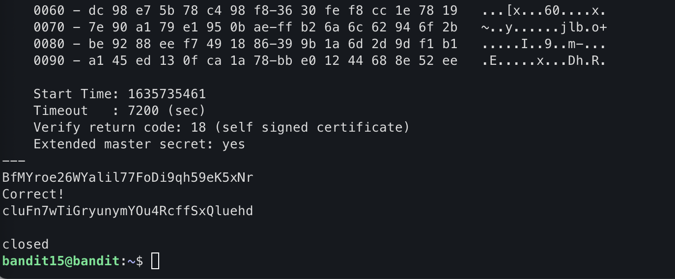 위와 같이 보기 힘든 값들이 출력되고, 맨 마지막에 입력 커서가 깜박깜박하여 bandit15의 pw를 넣어줬다.