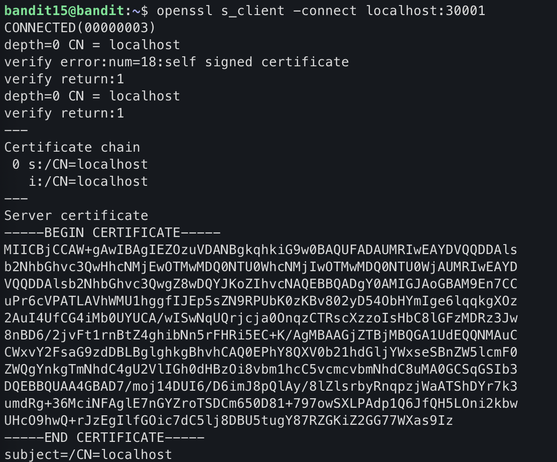 다음 레벨의 비밀번호는 SSL 암호화를 사용하여 localhost의 포트 30001에 현재 레벨의 비밀번호를 제출하여 검색할 수 있습니다.