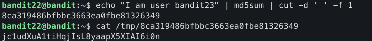 "I am user bandit23"를 해시화해서 임시파일명을 찾으면 그 임시파일에 bandit23의 Pw이 있을 것이다.