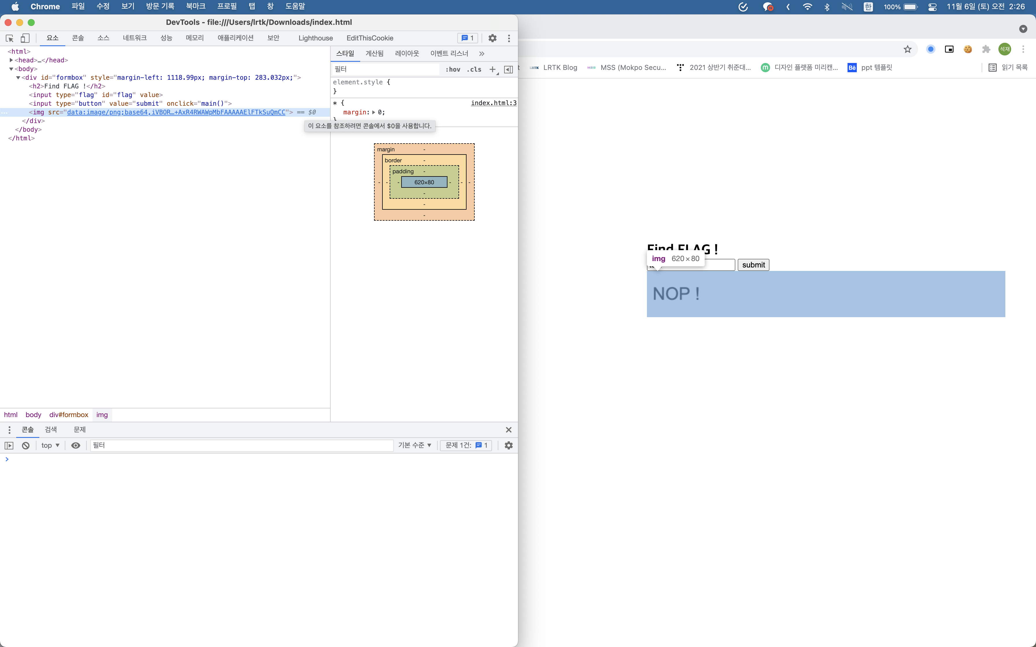 코드를 보기위해 개발자 도구를 살펴봤는데, NOP! 문구는 img 파일로 출력되고 있었다.