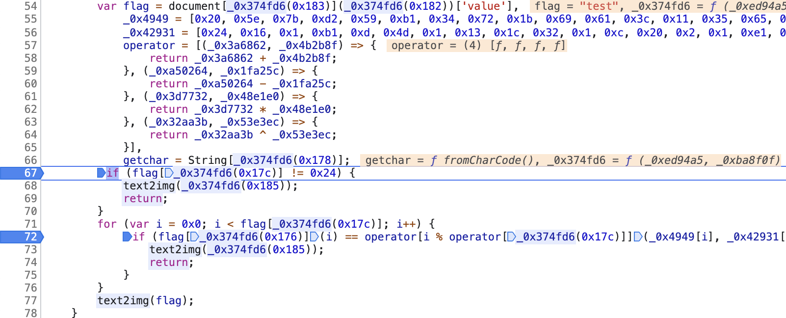분석한 결과를 알고나니, operator의 값들을 직접 찍어봐서 변수에 저장하면 flag가 나오겠다는 생각으로 이어졌다.