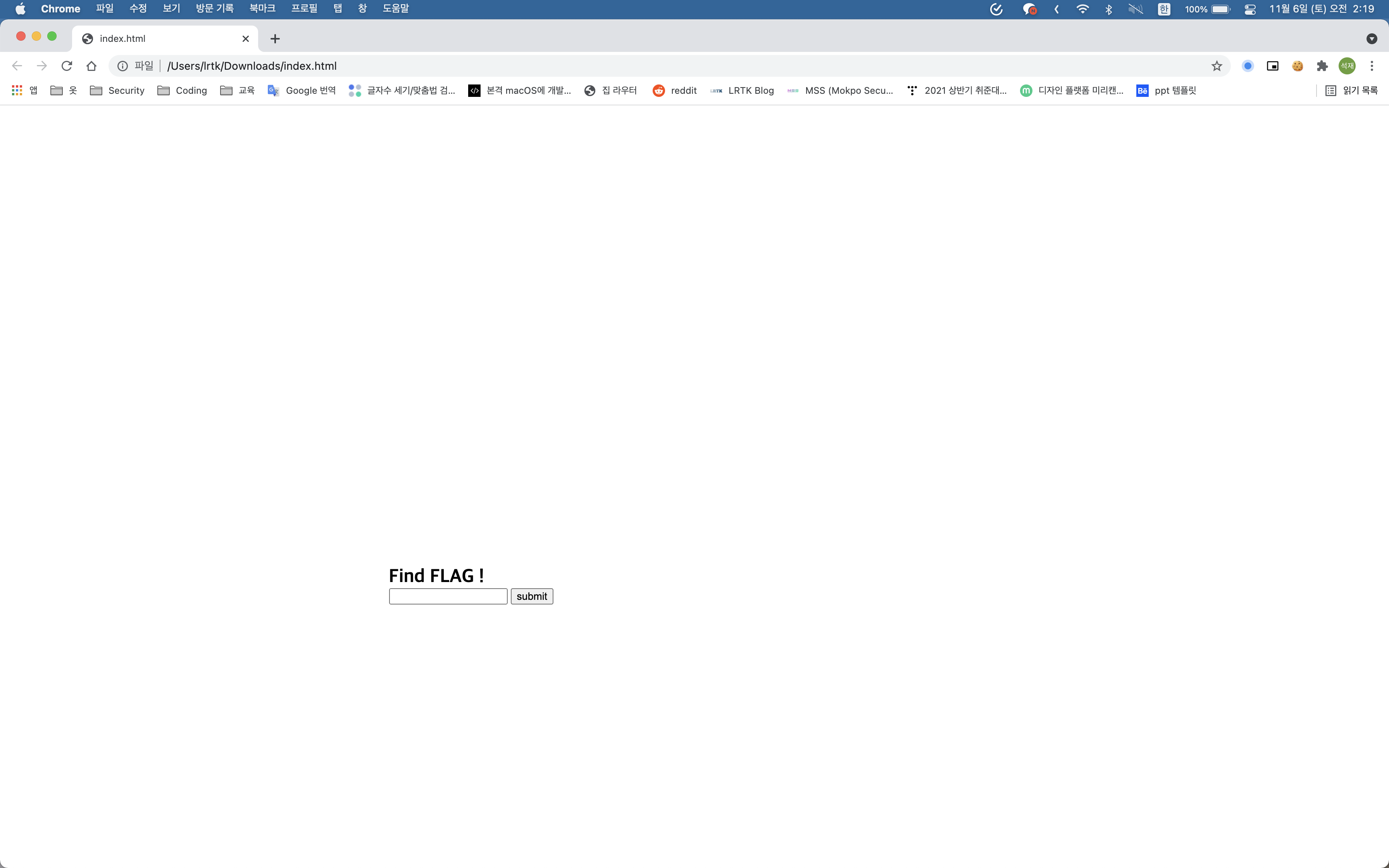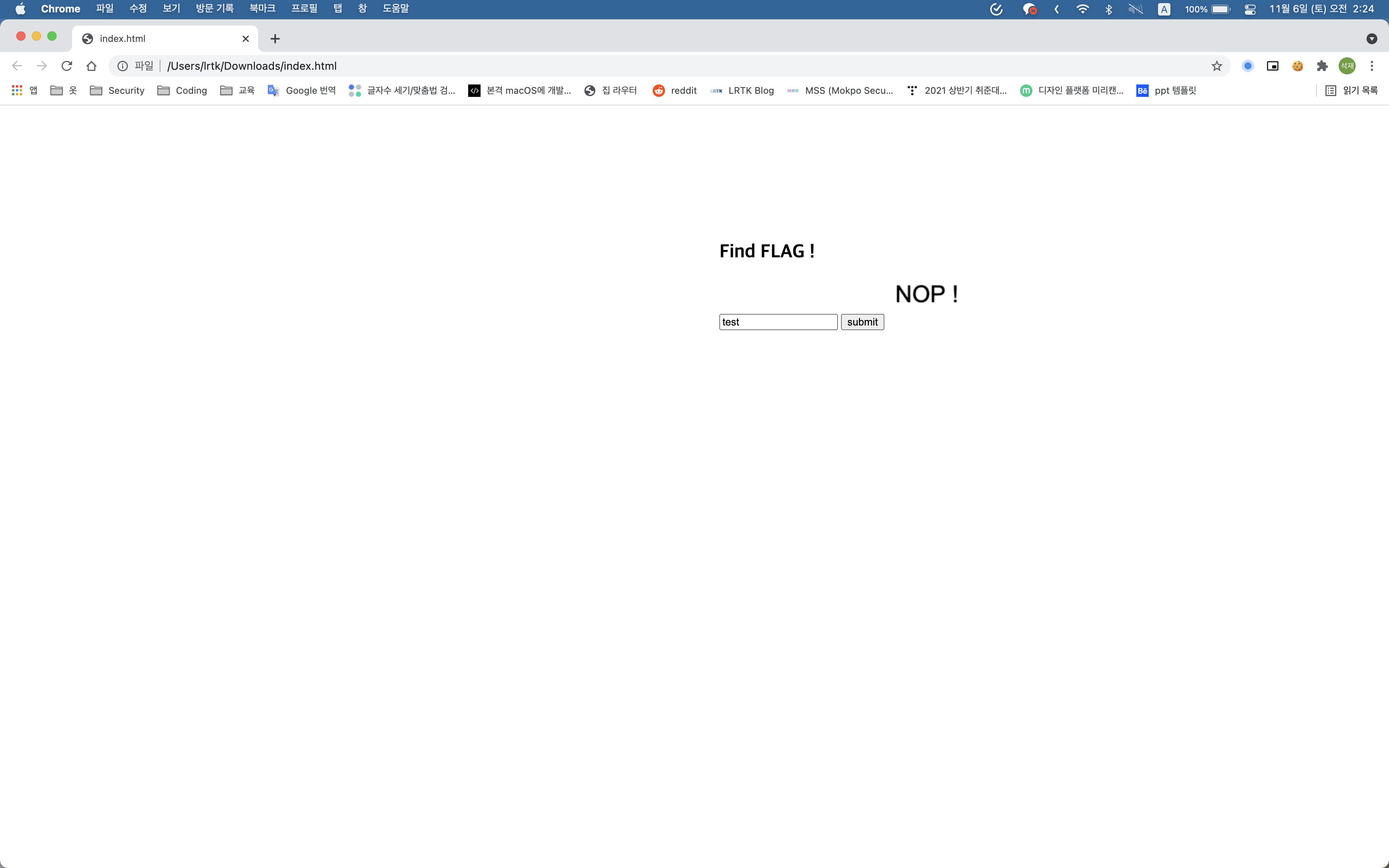 입력 폼에 데이터를 입력하여 맞으면 플래그, 틀리면 NOP !을 출력하는 HTML 페이지입니다.