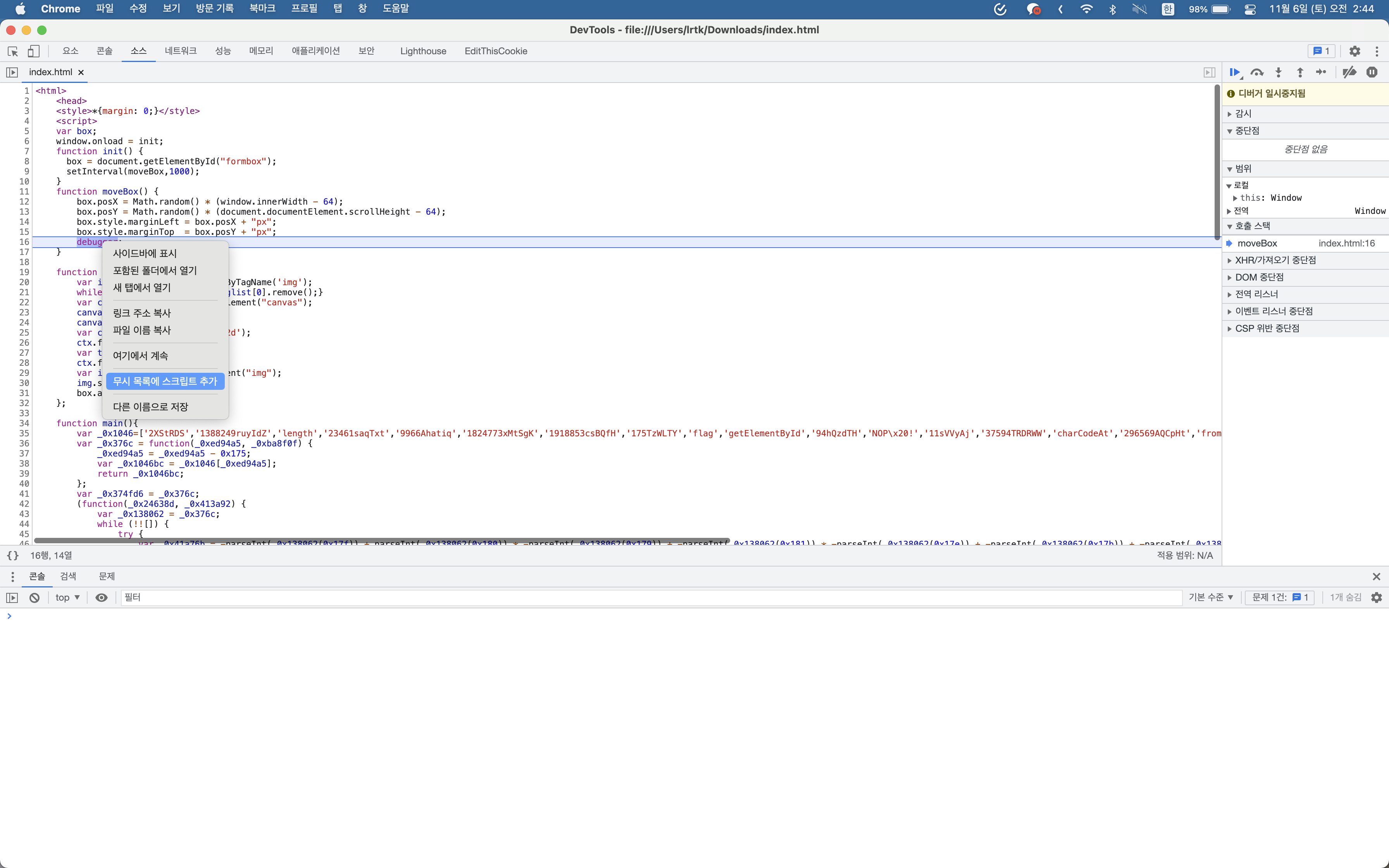 이를 무시하기 위해 개발자 도구의 소스에서 debugger를 무시 목록에 추가하였다.