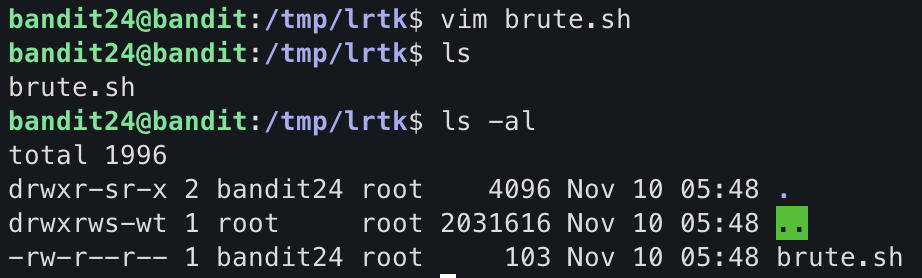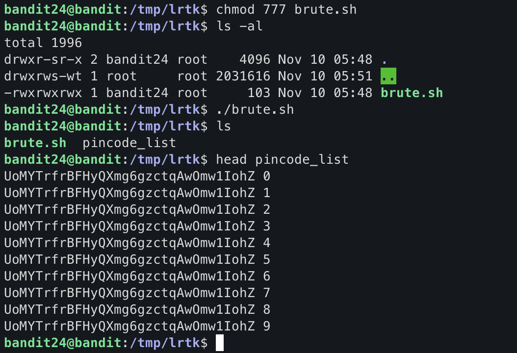 코드의 내용은 'bandit24의 pw 0' ~ 'bandit24의 pw 9999'을 출력하여 pincode_list 파일에 저장하겠다라는 코드이다.