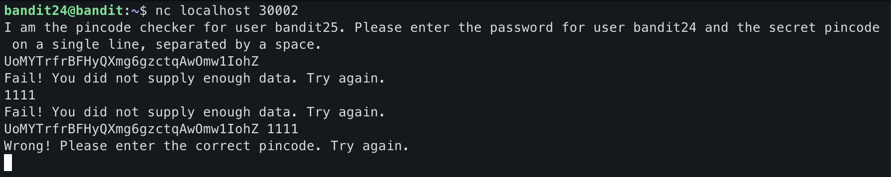 A daemon is listening on port 30002 and will give you the password for bandit25 if given the password for bandit24 and a secret numeric 4-digit pincode. There is no way to retrieve the pincode except by going through all of the 10000 combinations, called brute-forcing.