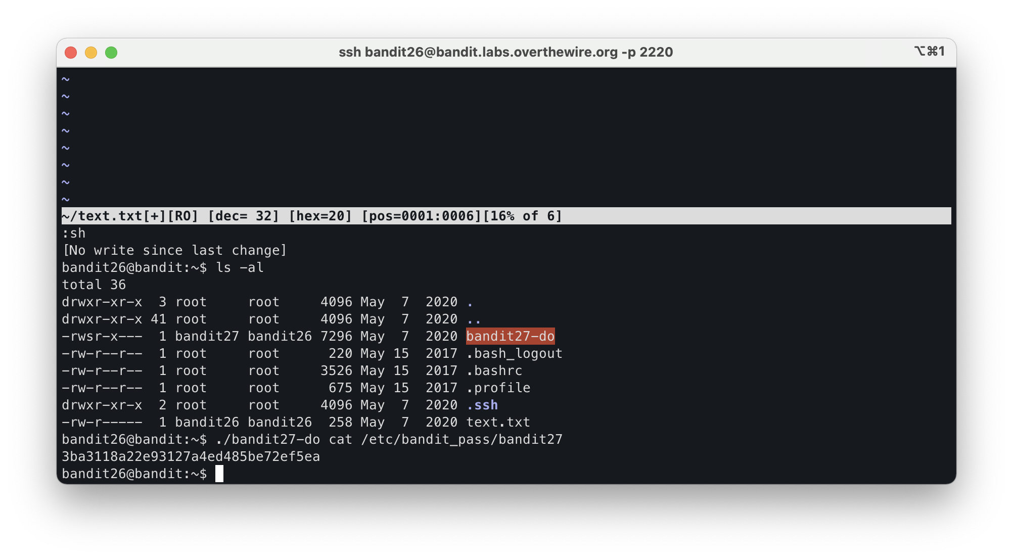bandit26의 홈 디렉토리를 확인해보니, bandit27-do 파일이 있었고 이를 이용하여 bandit27의 pw를 획득 할 수 있었다.