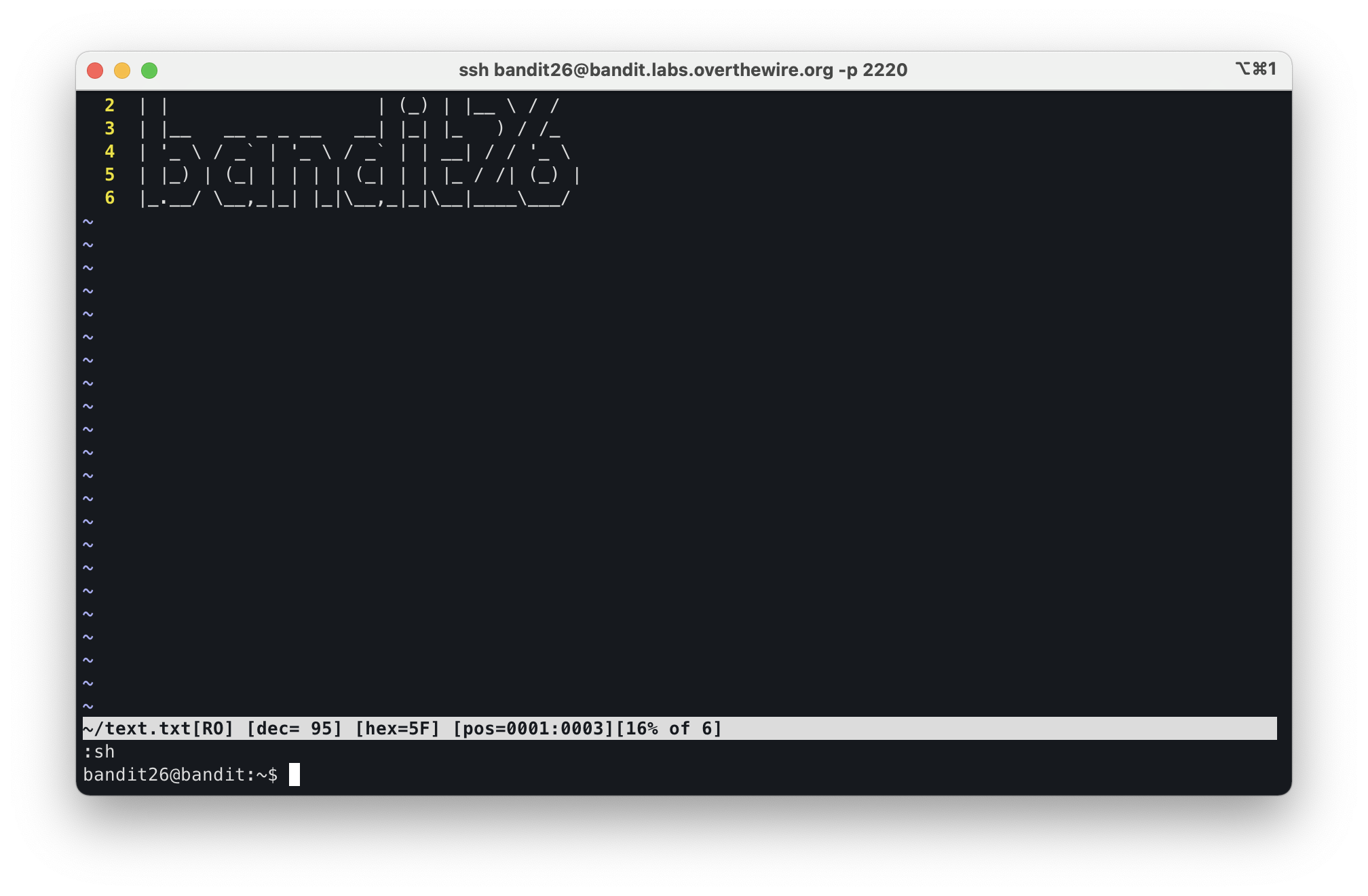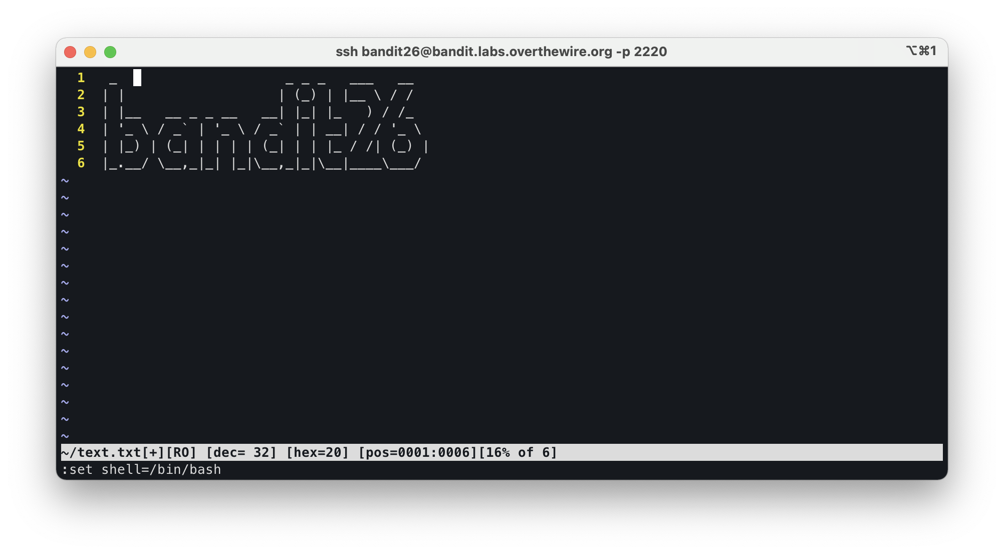 이번 문제는 bandit25 → bandit26 문제 풀이를 진행했으면 쉽게 풀 수 있는 방법이다.