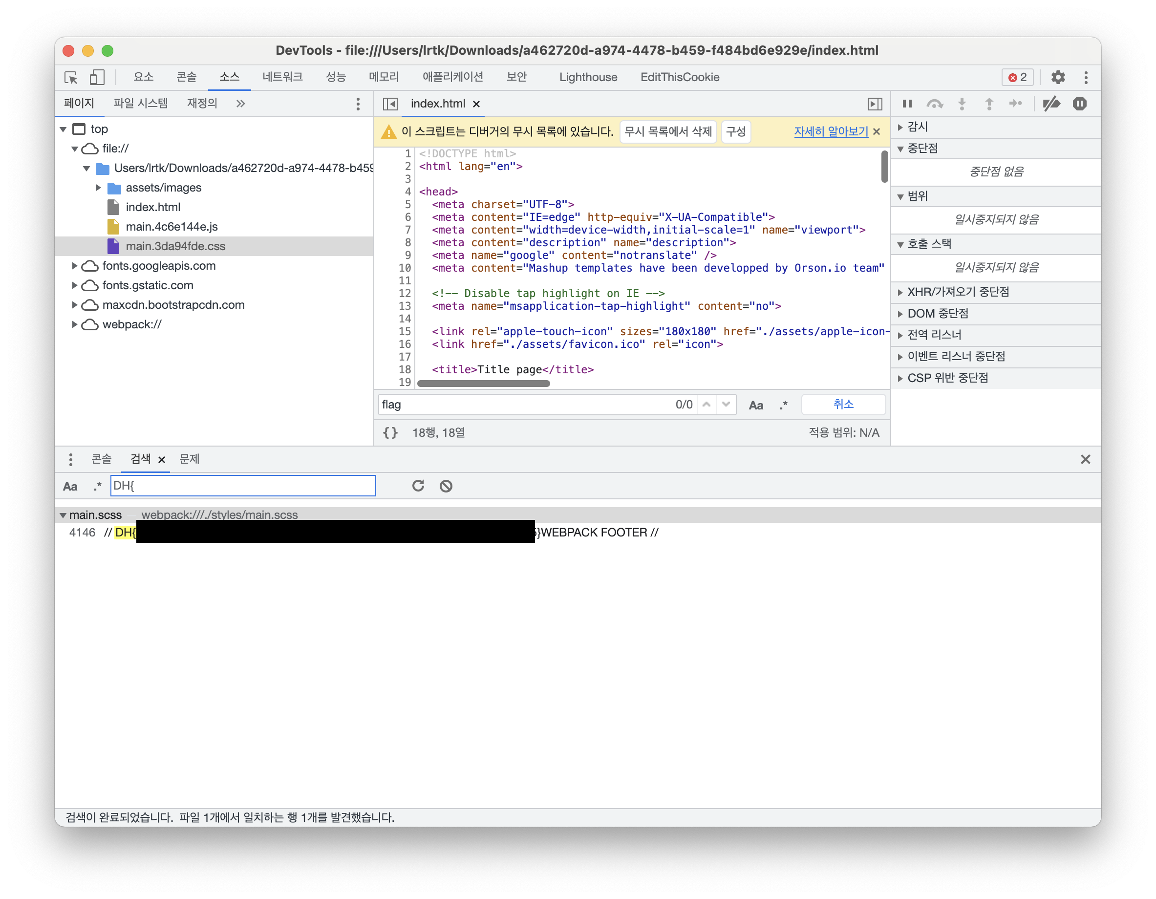 개발자 도구의 Sources 탭 기능을 활용해 플래그를 찾아보세요.