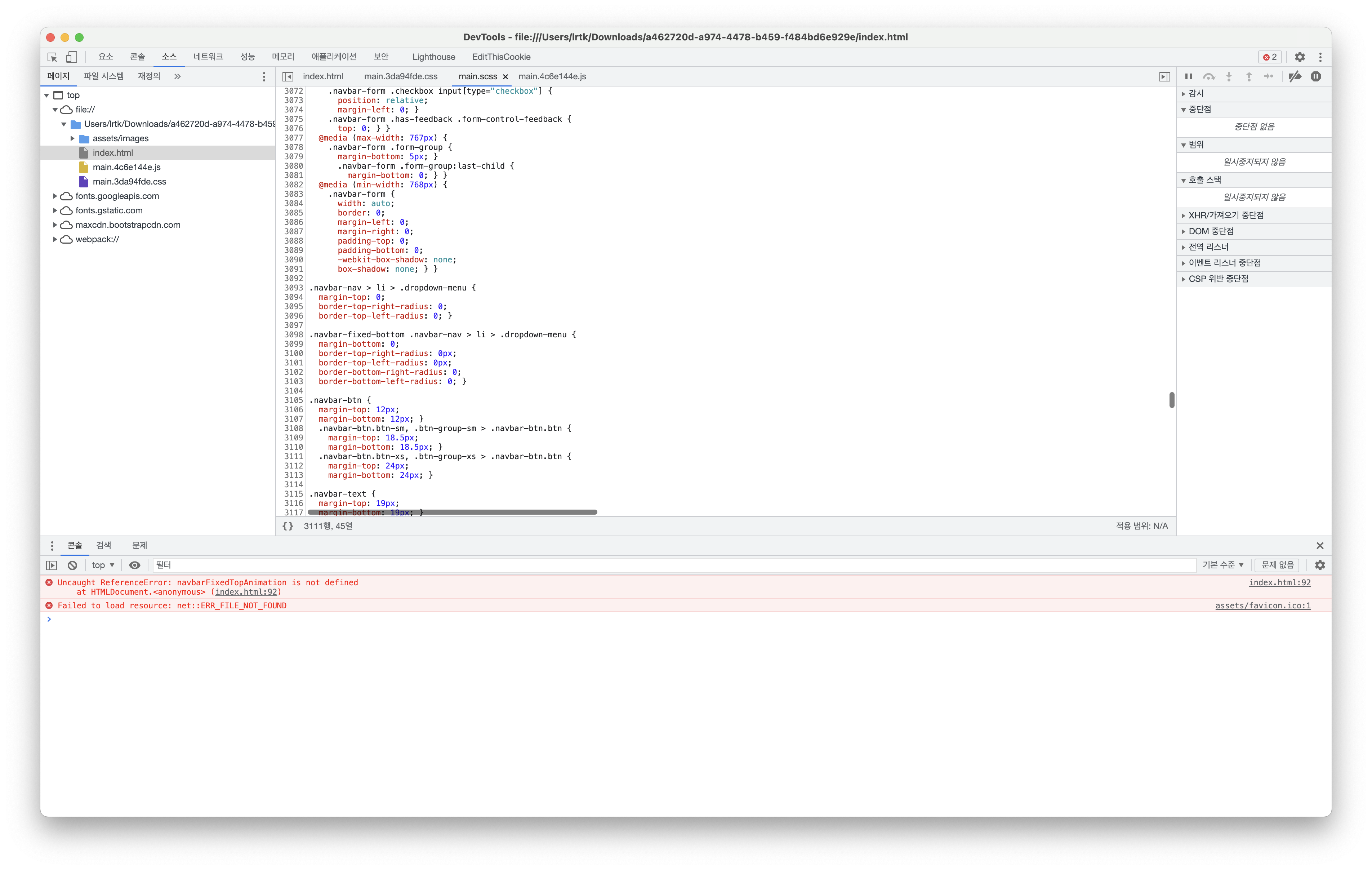 클릭해서 확인해보니, 웹팩을 이용했는지 css 파일이 한 줄로 구현되어있었다.