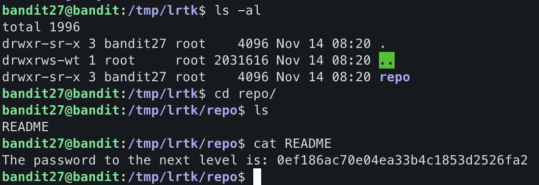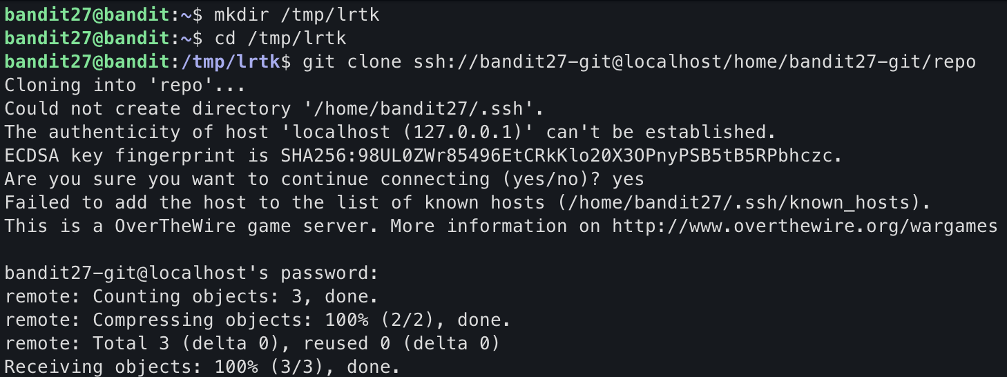 ssh://bandit27-git@localhost/home/bandit27-git/repo에 git 저장소가 있습니다. bandit27-git 사용자의 비밀번호는 bandit27 사용자의 비밀번호와 동일합니다.