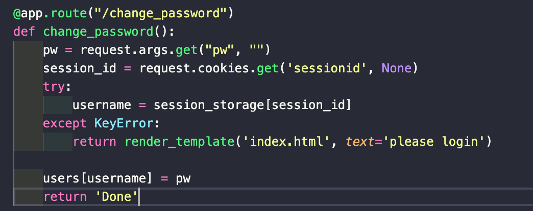 코드를 보면 Get 메소드로 pw 파라미터를 넘겨받고 세션으로 username을 찾아서 해당 username의 pw을 pw 파라미터로 변경한다.
