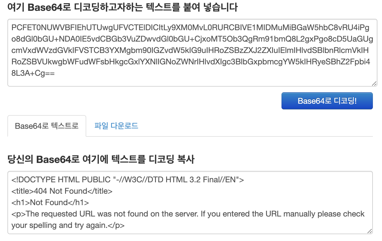 깨진 이미지의 값이 Base64로 이루어져 있어서 디코딩한 결과 404 Not Found가 출력됐다.
