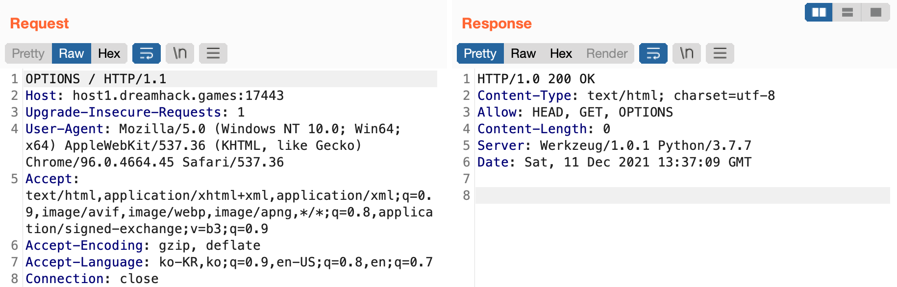 코드를 보니, GET 메소드가 아닐 때만 명령어가 실행됐다. 이것을 보고 바로 Burp Suite를 이용하여 OPTIONS 메소드로 사용 가능한 메소드를 확인하였다.