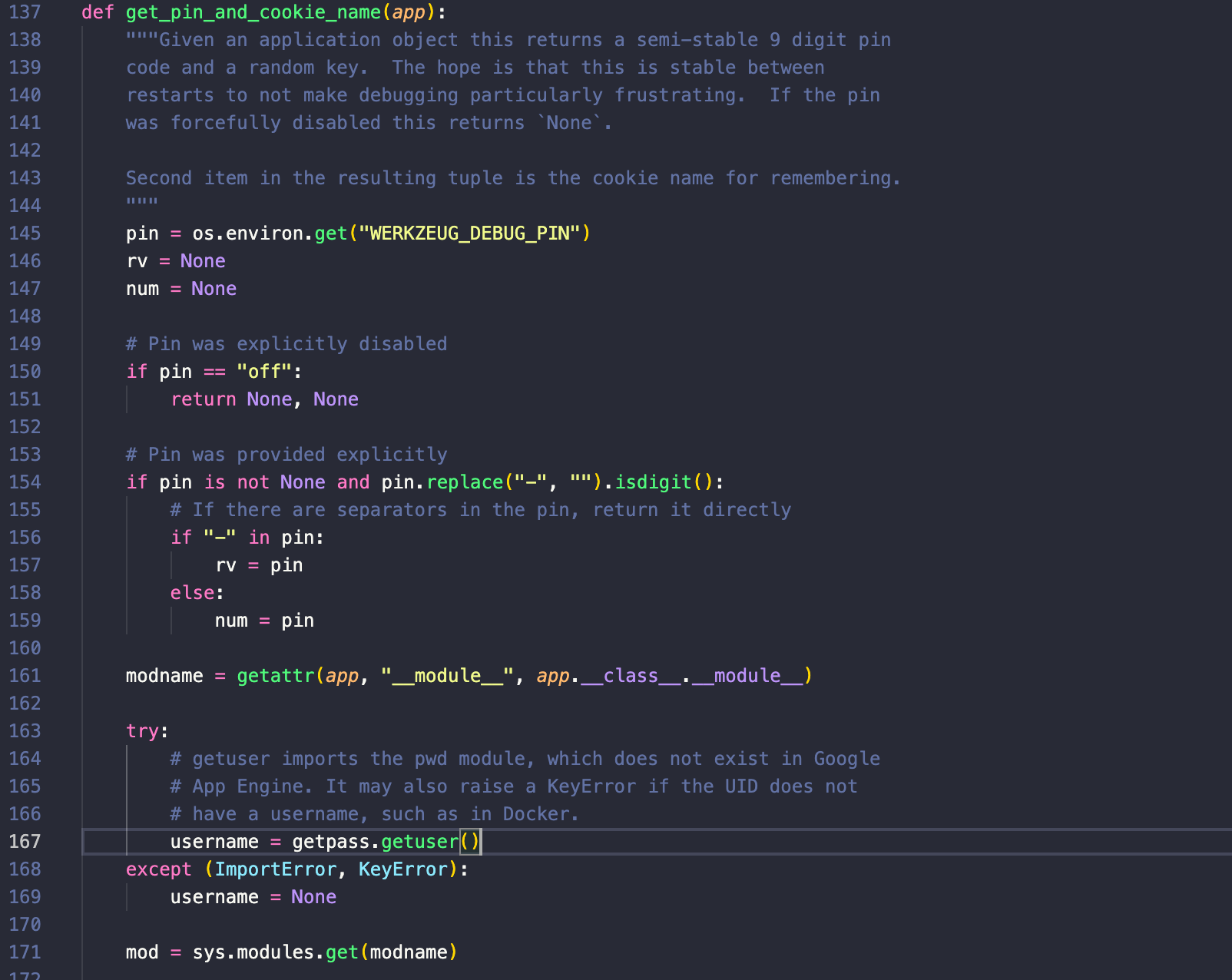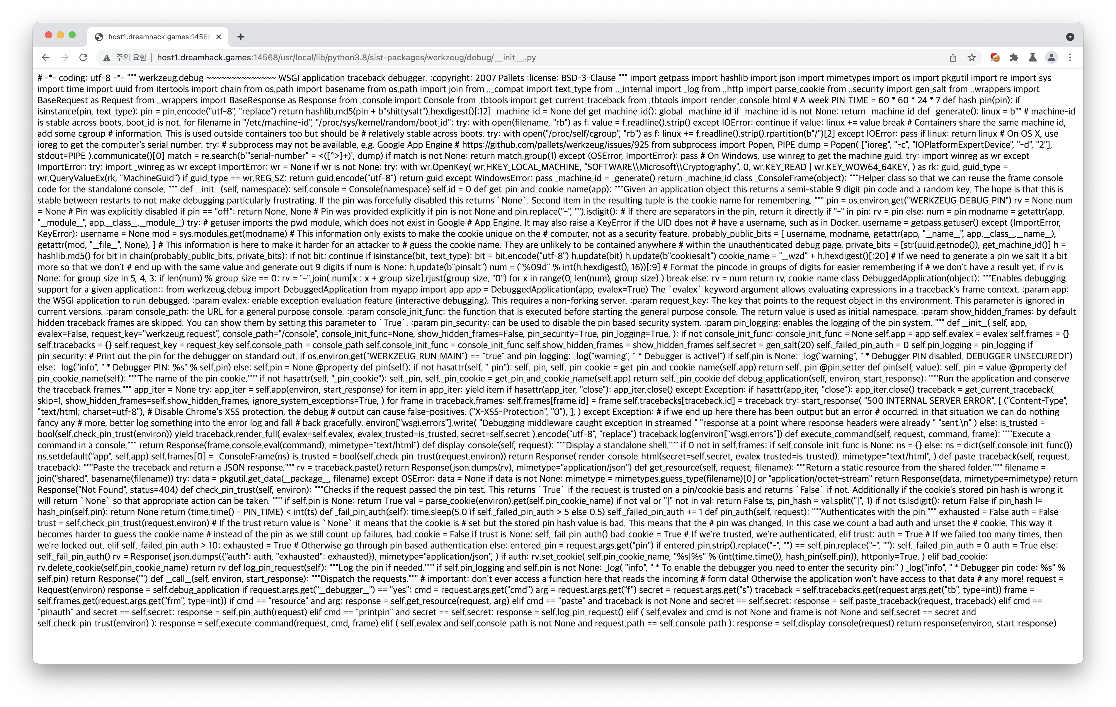 PIN을 생성하는 코드는 werkzeug의 __init__.py에 들어있다고 한다. Error 메시지를 살펴보면 위치가 그대로 보인다.
