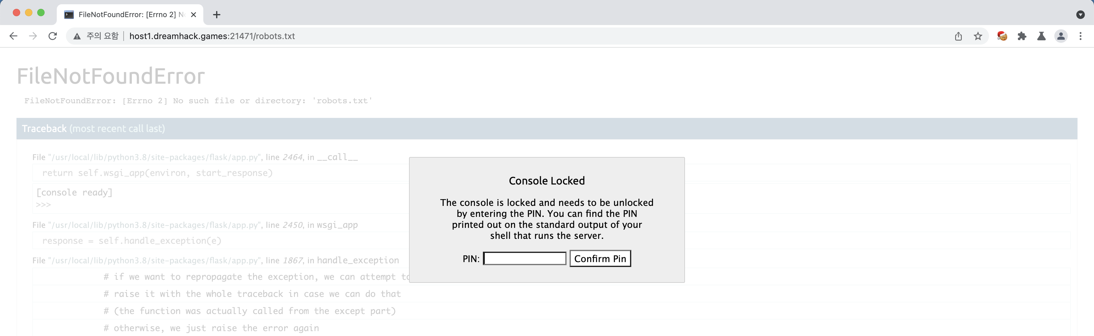 아무런 정보가 없어서 혹시나 하는 맘에 robots.txt를 요청하니, flask가 debugger 모드로 실행되고 있었다.