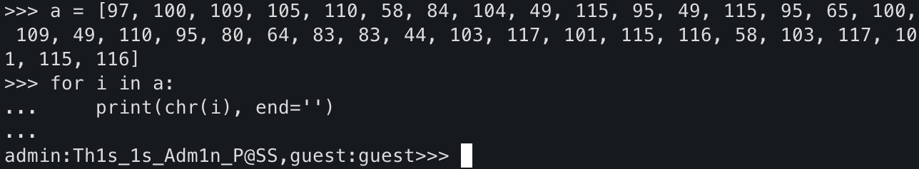 암튼 위와 같은 방법으로 찾은 값들은 97, 100, 109, 105, 110, 58, 84, 104, 49, 115, 95, 49, 115, 95, 65, 100, 109, 49, 110, 95, 80, 64, 83, 83, 44, 103, 117, 101, 115, 116, 58, 103, 117, 101, 115, 116이다.