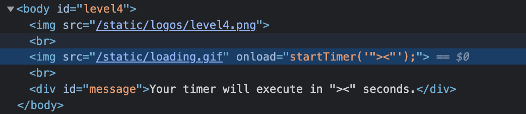 확인해보니, 문구 위에 돌아가는 로딩바를 갖겨오는 img 태그에서 on이벤트가 있고, on이벤트 안에 내가 입력한 입력값이 삽입되어 있었다.